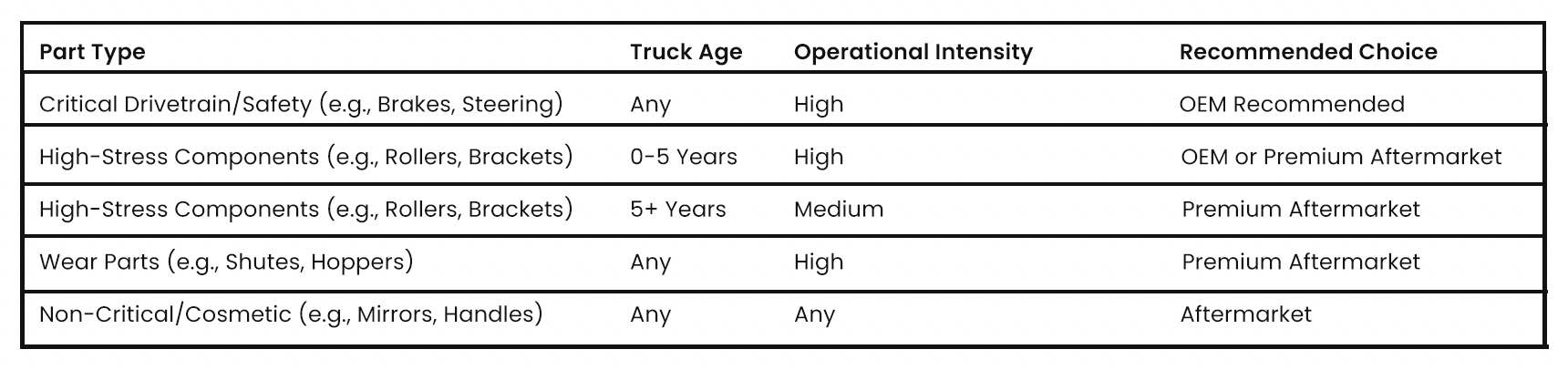 The right choice depends on the specific part, the age of the truck, and its role in your fleet. Here is a decision matrix to guide your thinking: